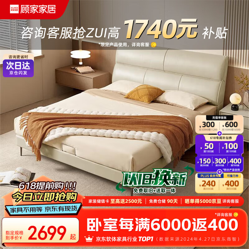 顾家家居(KUKA)现代简约真皮软床奶油风主卧双人床8136 白1.8*2.0m价格:2699.00元!