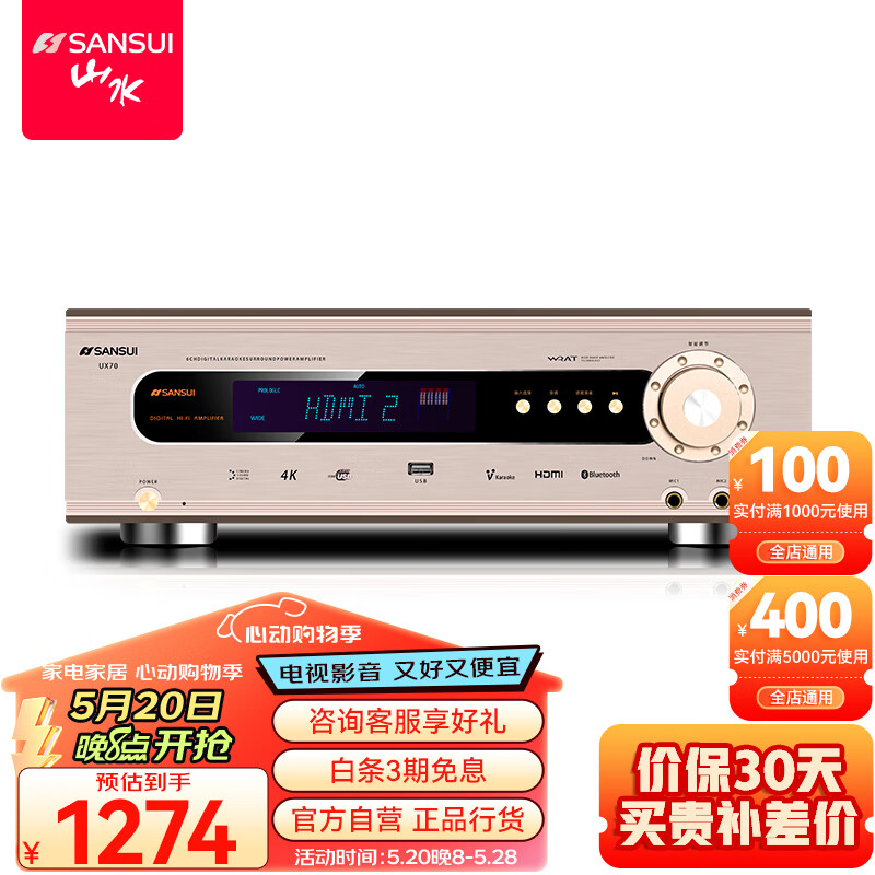 山水(SANSUI)ux70 音响功放 音箱 家庭影院5.1声道AV功放机 高保真无线蓝牙家用卡拉ok功放机 峰值1200W价格:1274.00元!