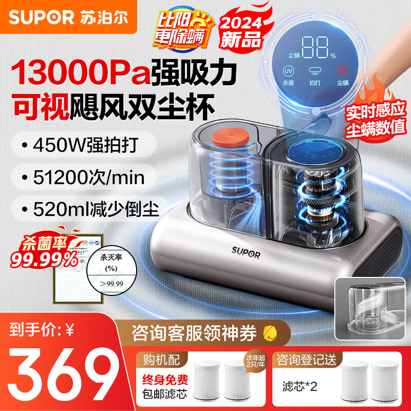 苏泊尔(SUPOR)除螨仪大吸力双尘杯尘螨分离家用床上吸尘器手持紫外线去螨虫神器除螨一体机礼品推荐ERC-TT6C价格:369.00元!