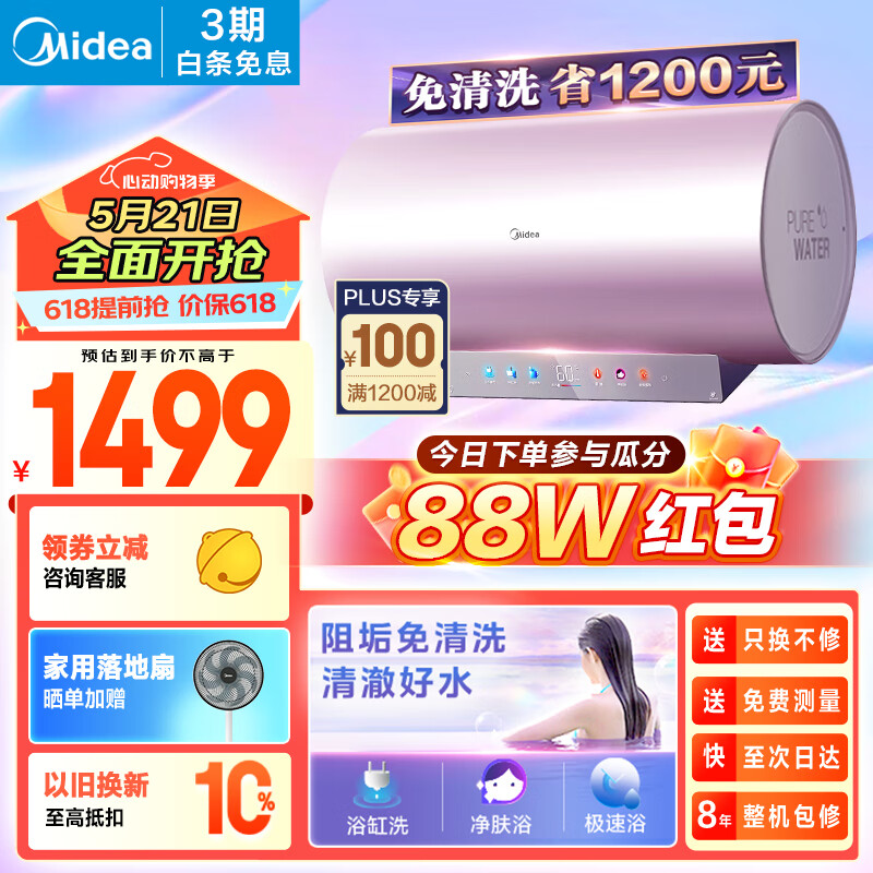 美的(Midea)免清洗电热水器80升家用 3300W变频 出水断电 镁棒免更换 阻垢 一级能效 储水式F8033-JE8(HE)价格:1599.00元!