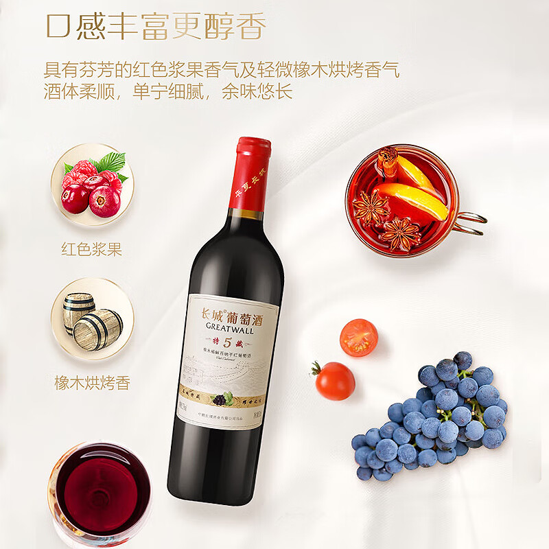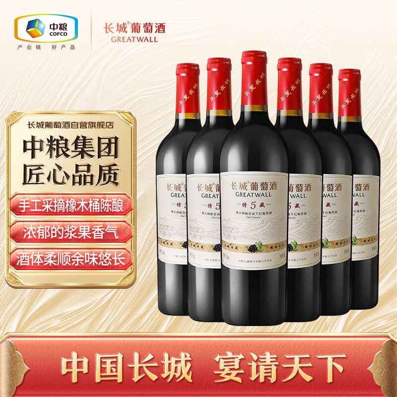 长城 特藏5橡木桶解百纳干红葡萄酒 750ml*6瓶 整箱装价格:308.00元!