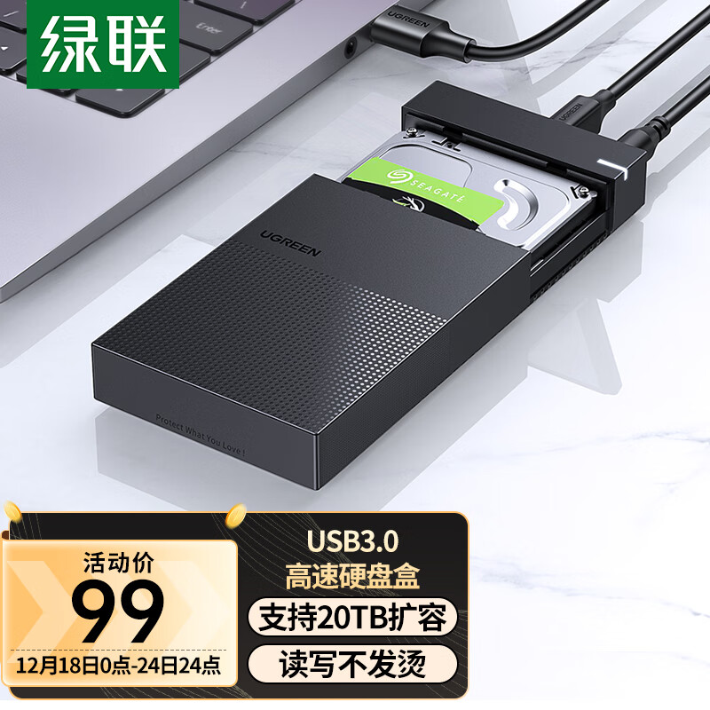 绿联 USB3.0移动硬盘盒 2.5/3.5英寸外置硬盘盒 适用笔记本电脑台式机外接SATA串口SSD固态机械硬盘盒子价格:99.00元!