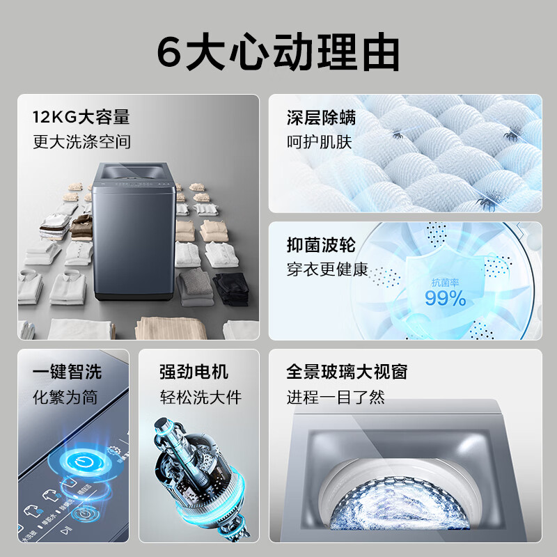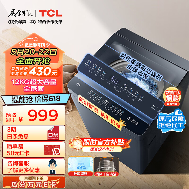 TCL 12KG超大容量全家桶T5 深层除螨 全景视窗 洗衣机全自动家用 以旧换新 宿舍租房神器 B120T5价格:999.00元!