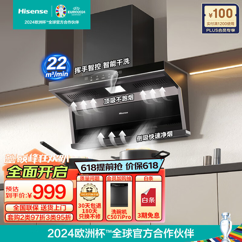 海信(Hisense)抽油烟机家用厨房7字型超薄顶侧双吸三吸吸油烟机22立方挥手智控自动清洗脱排油烟机DS10H以旧换新价格:999.00元!