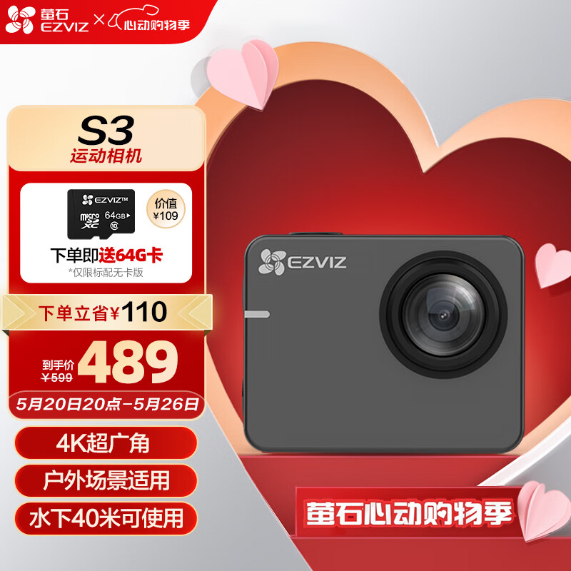 萤石S3运动相机 4K超广角 超清防抖 海康威视旗下 户外摩托骑行滑雪防水记录 摄像机 Vlog便携相机价格:489.00元!