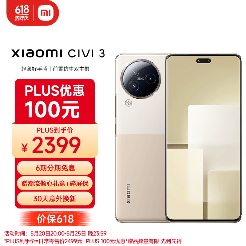 小米 Civi 3 前置仿生双主摄 光学防抖镜头 12GB+512GB 奇遇金 5g手机 澎湃OS SU7 汽车互联 AI手机价格:2499.00元!
