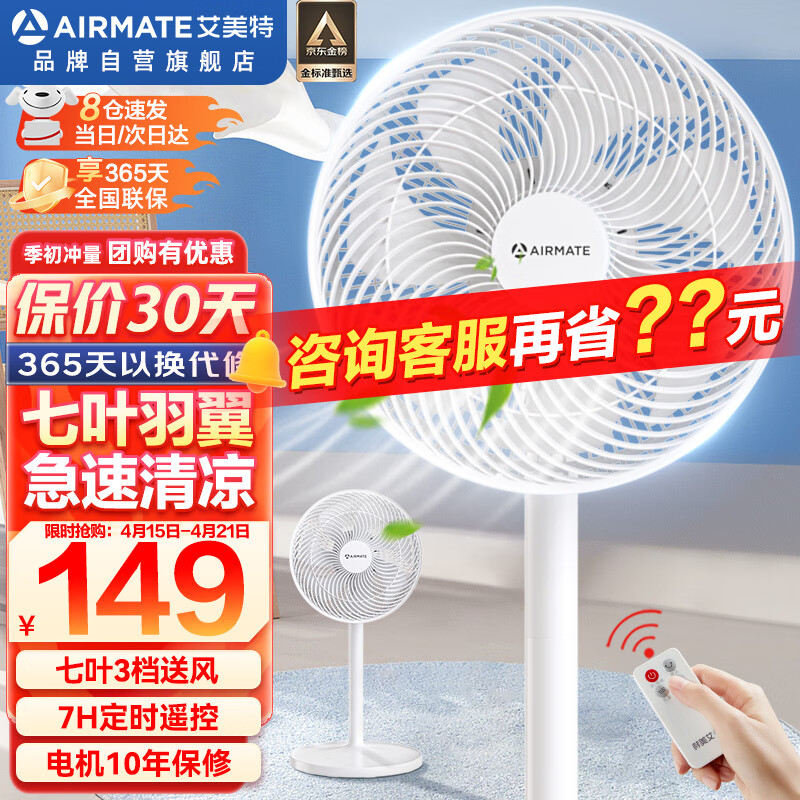 艾美特(AIRMATE)七叶家用遥控电风扇大风量摇头立式落地扇学生宿舍办公节能风扇轻音柔风定时台立两用落地式风扇 FS30143R(7叶大风轻音-遥控升级款)价格:199.00元!