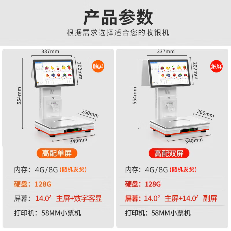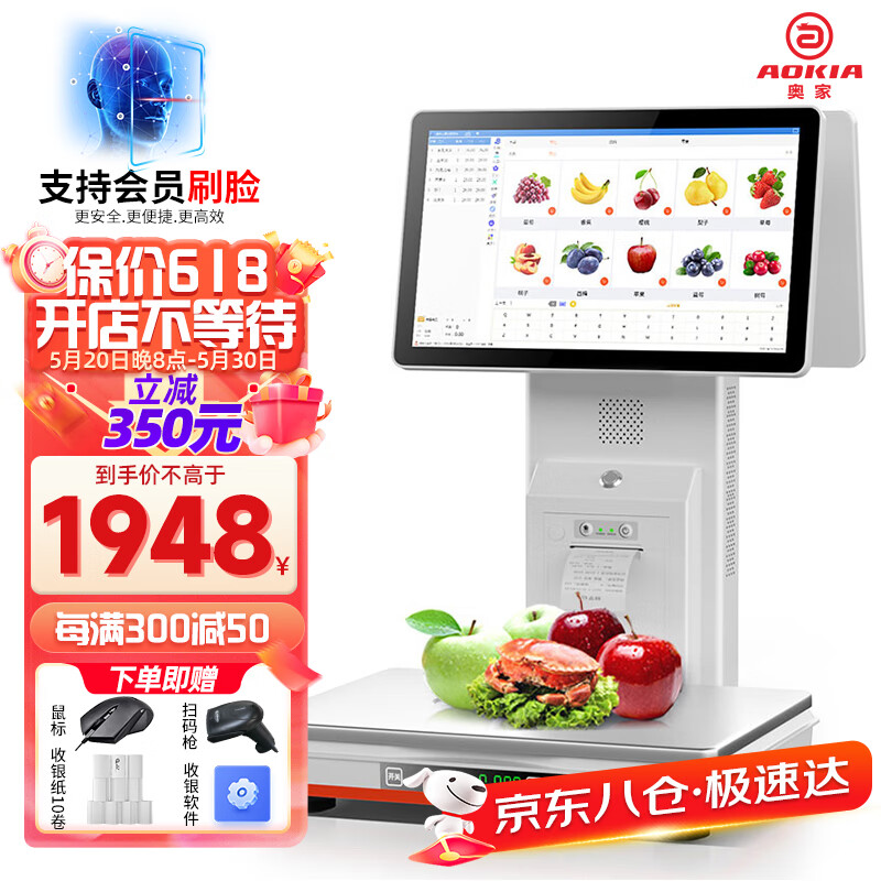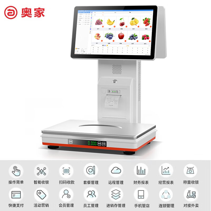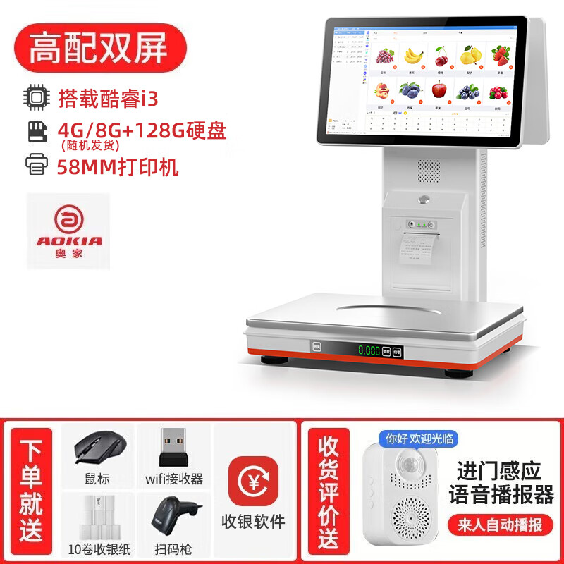 奥家Ai智能识物称重一体机收银秤收银机果蔬熟零食店生鲜超市便利店电子秤收款机电脑系统扫码点餐收银 酷睿i3双屏秤(8+128G)+收银大礼包价格:2298.00元!