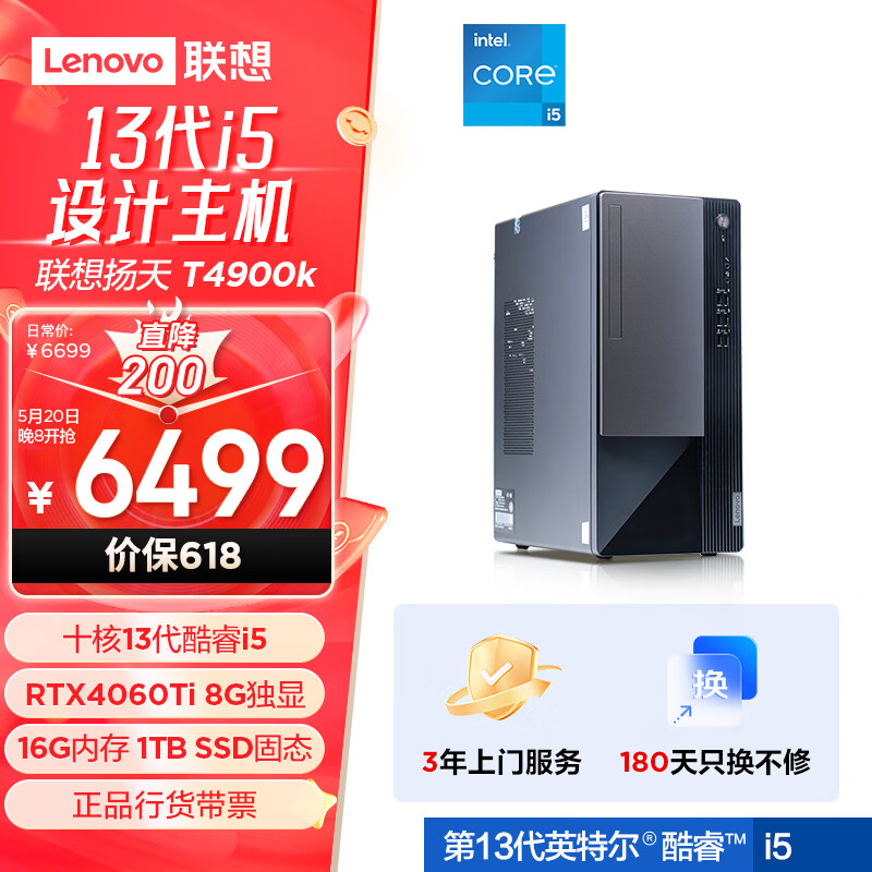 联想(Lenovo)T4900k 设计师游戏商用台式电脑主机(13代酷睿i5-13400F RTX4060Ti 8G 16G 1TB SSD)价格:6499.00元!