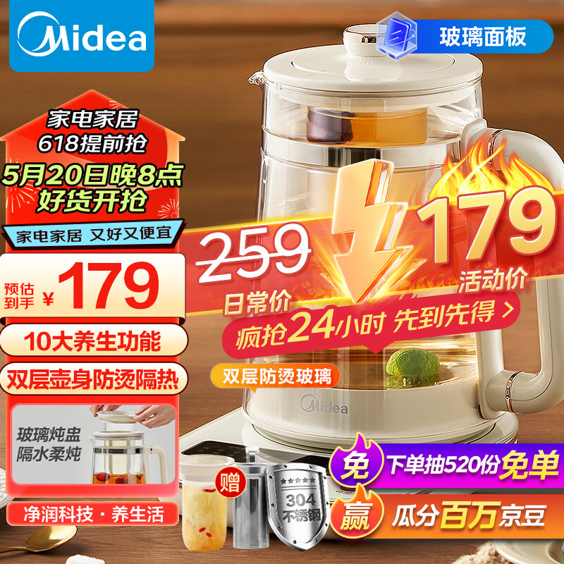 美的(Midea)灵感养生壶 玻璃面板烧水壶1.5L煮茶器 24H智能预约电热水壶 多段控温恒温保温煮茶器 MK-YSAS1502价格:179.00元!