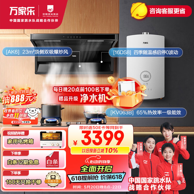 万家乐烟灶热三件套 23立方顶侧双吸油烟机16L变频水伺服燃气热水器套装AK6+KV063B+16DS8天然气价格:3649.00元!