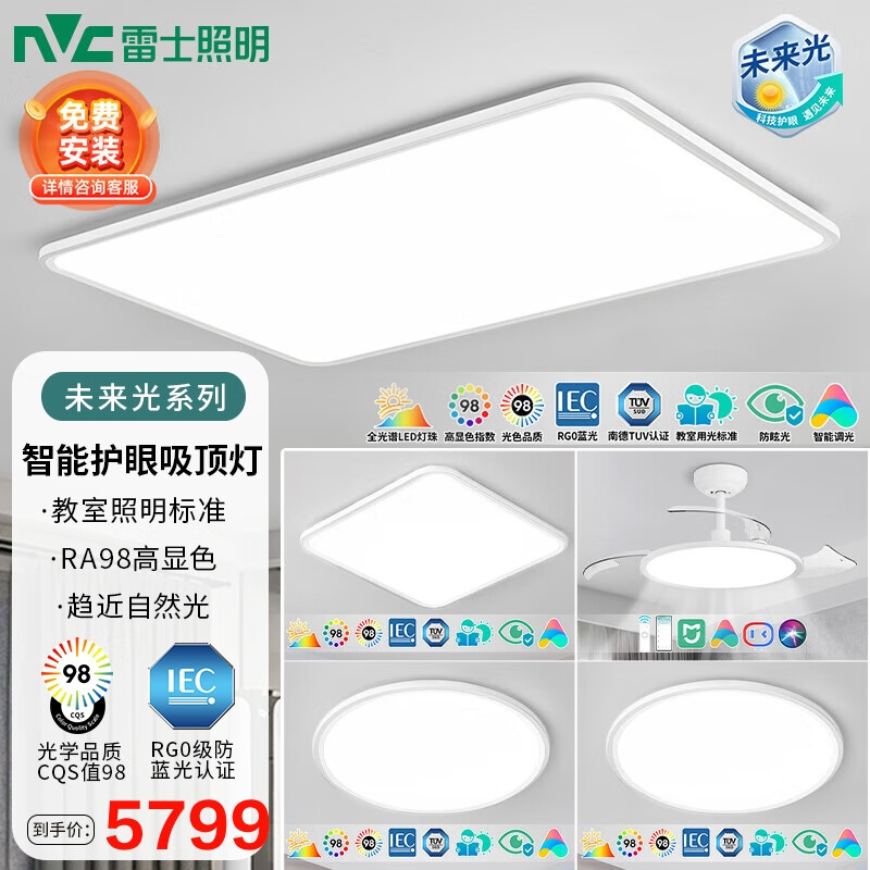 雷士(NVC)LED吸顶灯 现代简约客厅卧室灯具智控Ra98护眼全光谱灯饰未来光C价格:5799.00元!