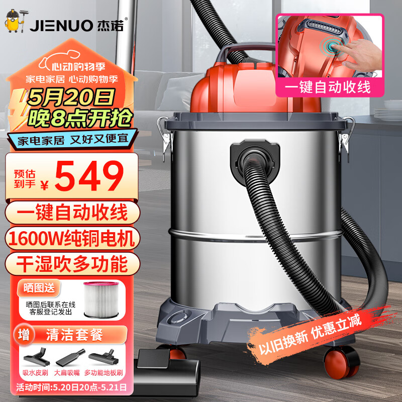 杰诺1600W大功率干湿吹三用家用商用桶式吸尘器办公室地毯装修一键收线Z3价格:549.00元!