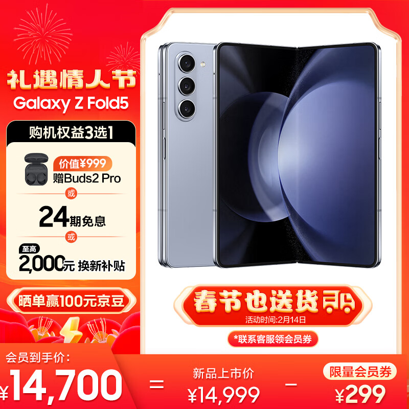 三星 SAMSUNG Galaxy Z Fold5 超闭合折叠 IPX8级防水 5G折叠手机 12GB+1TB 冰萃蓝价格:14999.00元!