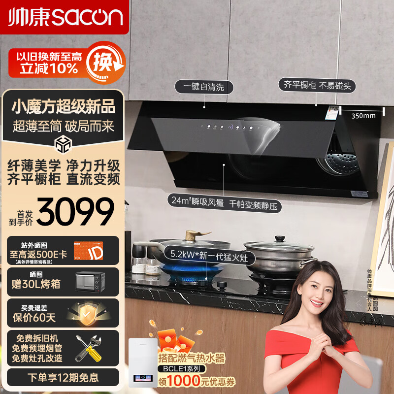 帅康(Sacon)超薄侧吸油烟机 350mm橱柜齐平 家用24m3爆炒自清洗超薄烟机搭新一代猛火灶C8315+B88天然气价格:3099.00元!
