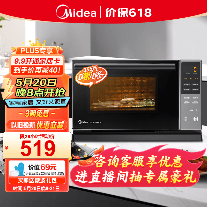 美的(Midea)微碳系列 下拉门微波炉 附烤箱功能 杀菌家用 800w变频 光波速热(PC20M5T)价格:519.00元!