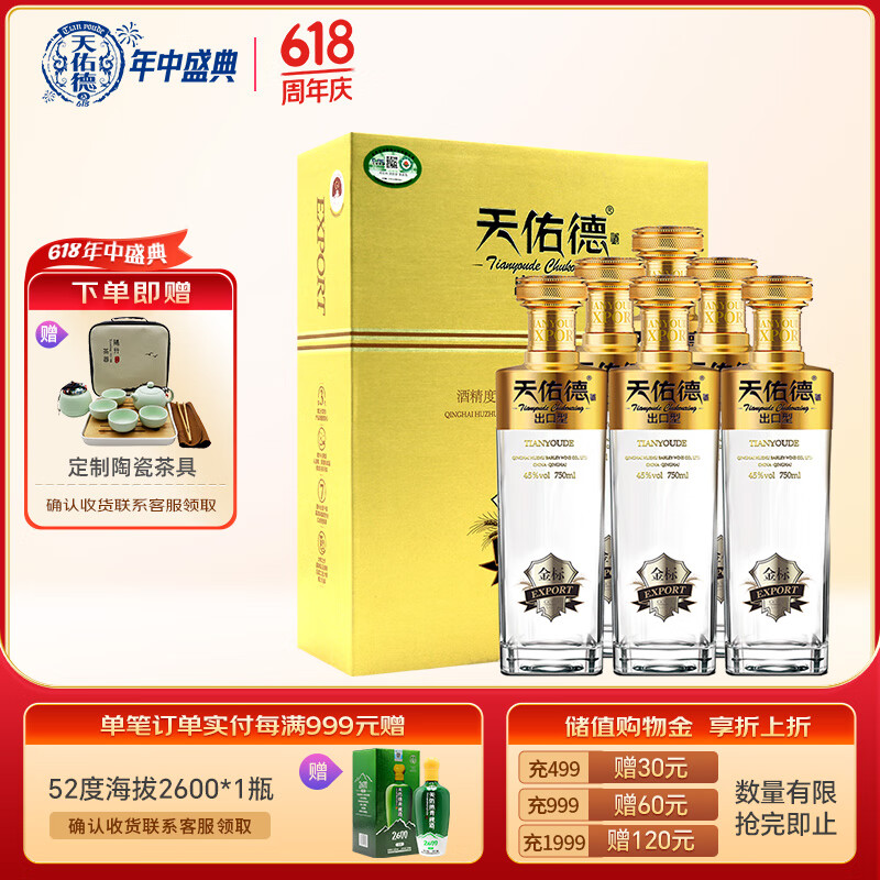 天佑德 金标出口型第三代 清香型白酒 45度 750ml*2瓶*3盒 礼盒整箱装价格:2518.00元!