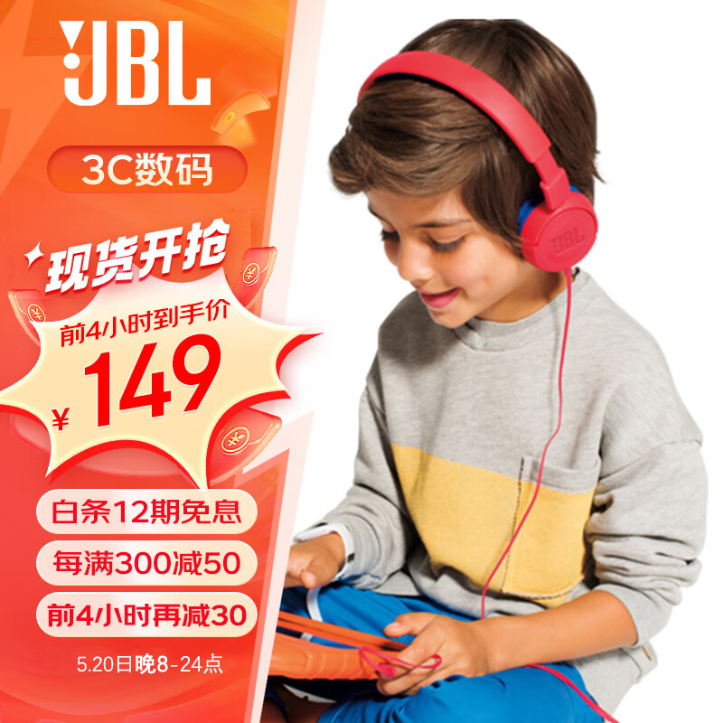 JBL JR300 儿童耳机头戴式 低分贝益智耳机沉浸式培养学生专注力英语学习网课听音乐耳机 亮红色价格:149.00元!