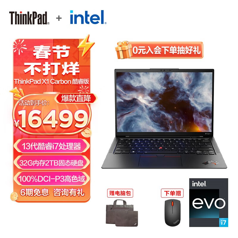 ThinkPad X1 Carbon 联想 14英寸高性能商务轻薄笔记本电脑13代英特尔酷睿处理器LTE全时互联 13代i7 32G 2TB 2.8K 03CD价格:16499.00元!