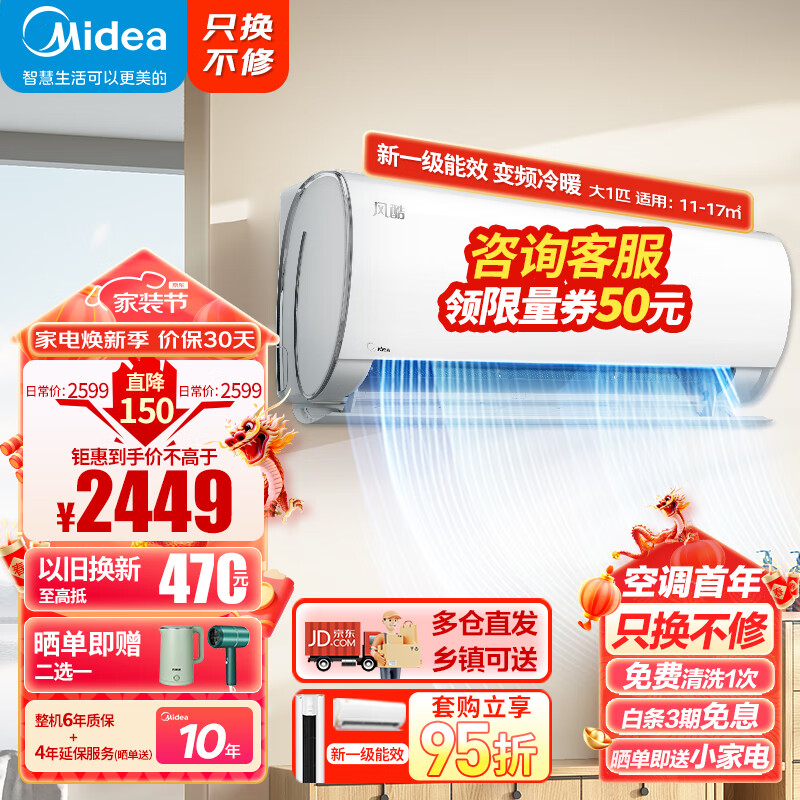 美的(Midea)空调挂机 1匹 风酷Ⅱ 新一级能效 变频冷暖 自清洁 卧室壁挂式 智能家电 KFR-26GW/N8XHC1Ⅱ价格:2449.00元!