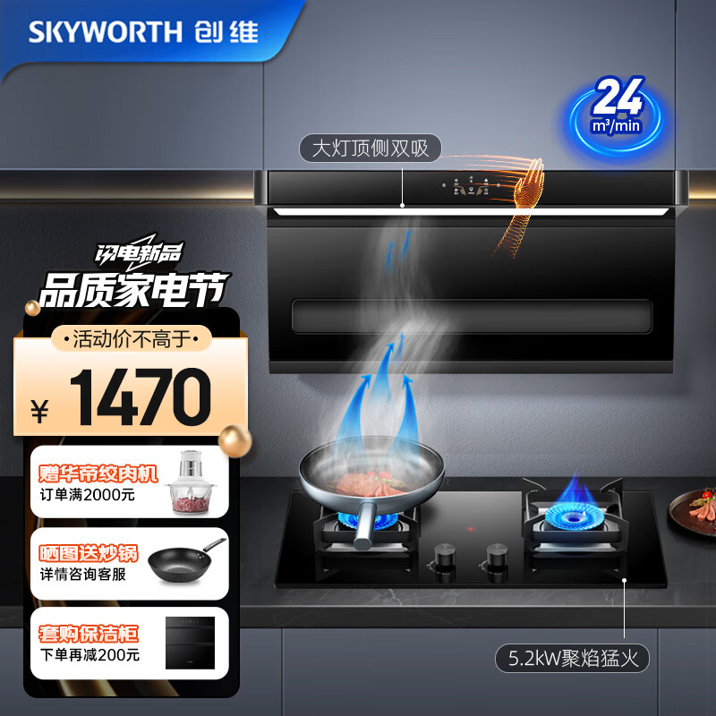 创维(Skyworth)7字顶侧双吸 抽吸油烟机灶具套装家用24风量排油烟机燃气灶套餐烟灶自动清洗挥手Y703+Z57B天然气价格:1248.00元!