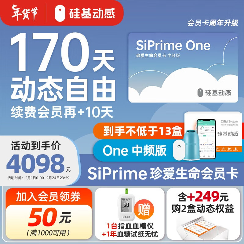 硅基动感 动态血糖仪 ONE中频版SiPrime 170天测糖无忧 免采血家用免校准持续血糖监测仪价格:4398.00元!