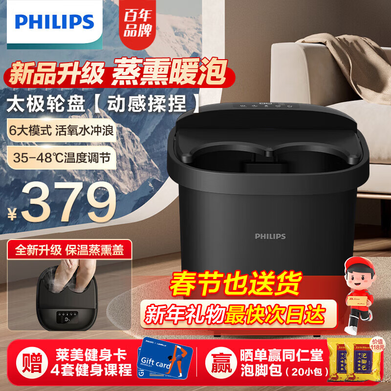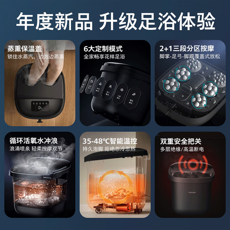 飞利浦(PHILIPS)泡脚桶加热足浴盆全自动按摩洗脚盆泡脚盆加热自动按摩足浴桶全自动泡脚桶按摩洗脚桶生日礼物 【年度升级·蒸熏泡】6大模式价格:479.00元!