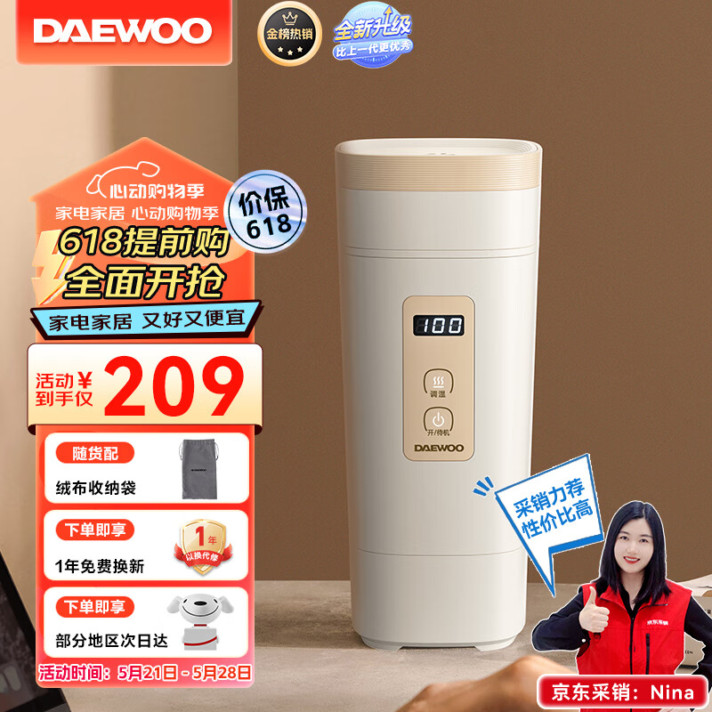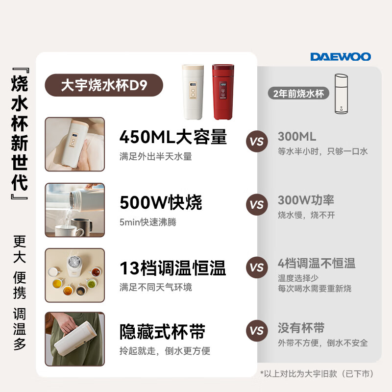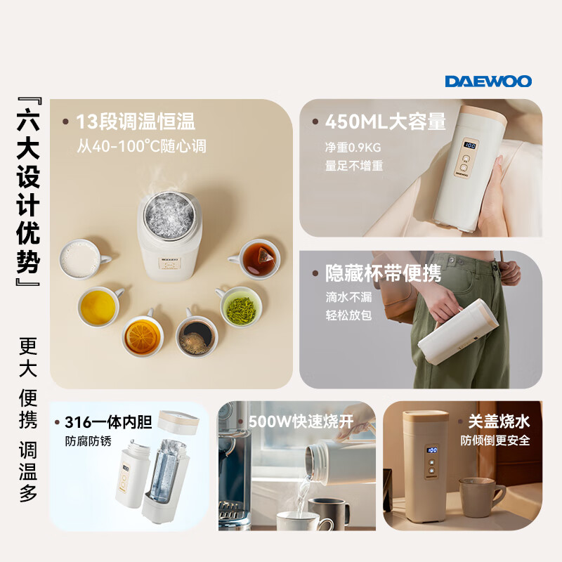 大宇(DAEWOO)便携式烧水壶 电热加热水杯 旅行电热水壶旅游电水壶保温杯恒温水壶婴儿防倾漏不烫伤316不锈钢 D9价格:197.00元!