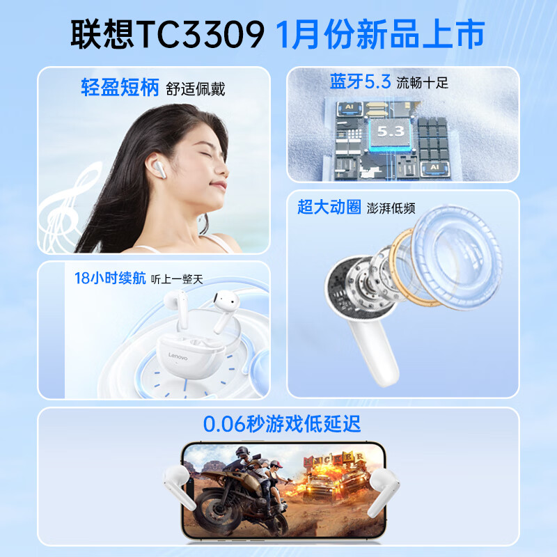 联想(lenovo)蓝牙耳机真无线 半入耳舒适佩戴 蓝牙5.3游戏运动音乐耳机适用于苹果华为小米手机TC3309黑色价格:109.00元!