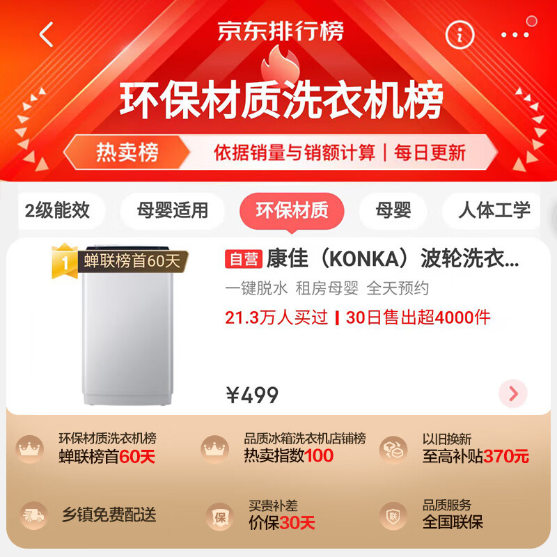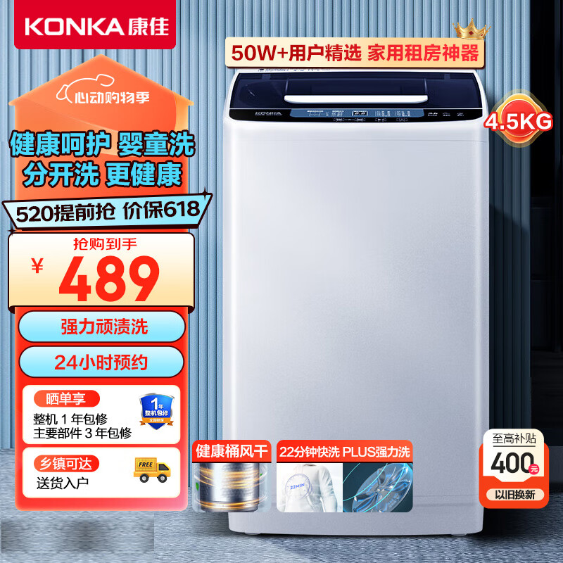 康佳(KONKA)波轮洗衣机全自动4.5公斤 迷你婴儿小型儿童内衣洗衣机小 22分钟快洗 XQB45-288价格:489.00元!