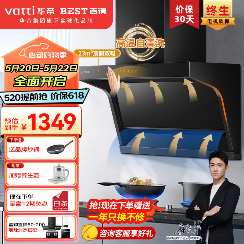 百得(BEST)华帝出品 顶侧双吸油烟机 家用7字型抽油烟机脱排23立方大吸力挥手感应自动洗 CXW-280-E600价格:1349.00元!