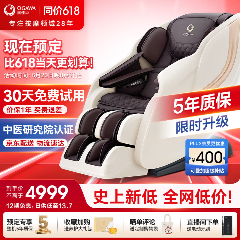奥佳华(OGAWA)按摩椅2024十家用太空舱全身零重力智能按摩沙发3D机芯中医养生小户型老人豪华头等舱7508Ne 大地棕价格:8989.00元!