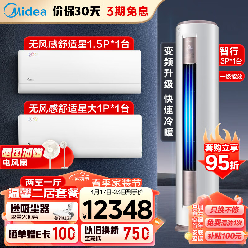 美的(Midea)空调套装 两室一厅(大1匹舒适星一级+1.5匹舒适星一级挂机+3匹智行柜机一级)一套购齐价格:12997.00元!