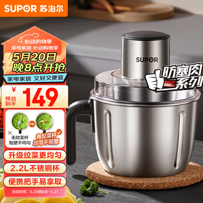 苏泊尔(SUPOR)绞肉机绞馅机不锈钢家用多功能搅肉机2.2L电动切菜打肉碎肉机搅拌机JR56-U价格:149.00元!