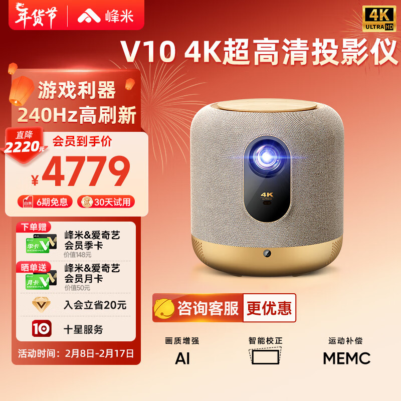 峰米 V10 4K超高清 游戏投影 投影仪家用 (2500ANSI流明 画面智能校正 240Hz高刷新率 AI画质增强)价格:4799.00元!