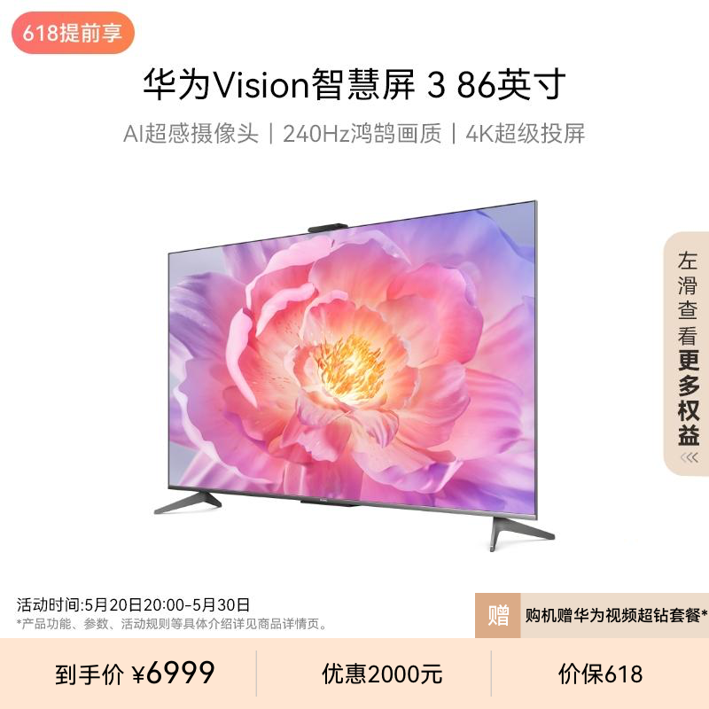 华为Vision智慧屏 3 86英寸 4K超级投屏 Pura 70投屏好搭档 AI摄像头 240Hz屏电视85寸HD86QINA价格:6999.00元!