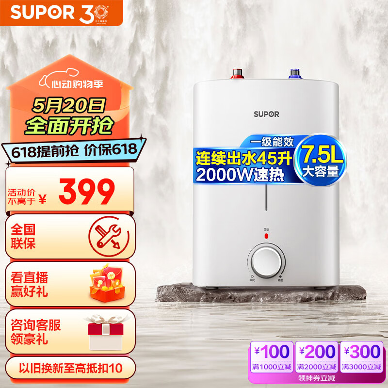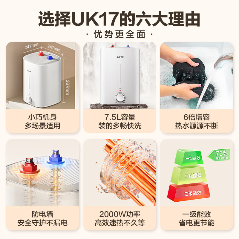 苏泊尔(SUPOR)一级能效7.5L迷你电热水器 小厨宝厨房热水器速热式 2000W家用储水式热水宝 UK17价格:399.00元!