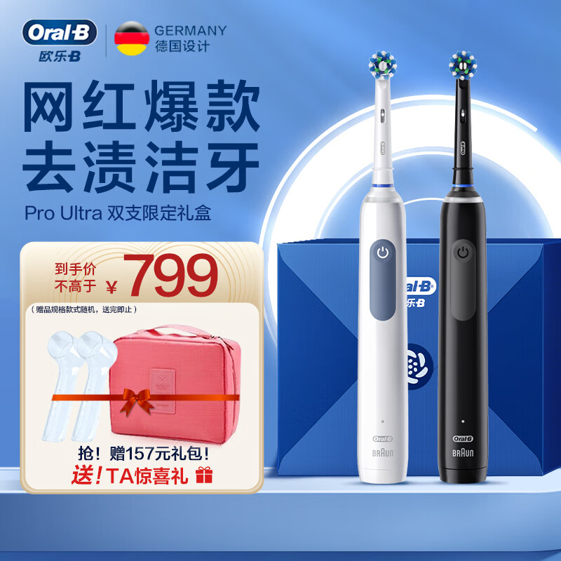 欧乐B成人电动牙刷Pro4Ultra双支甄选礼盒Pro系列3D声波圆头深度清洁牙龈按摩送男友送女友情人节礼物价格:879.00元!