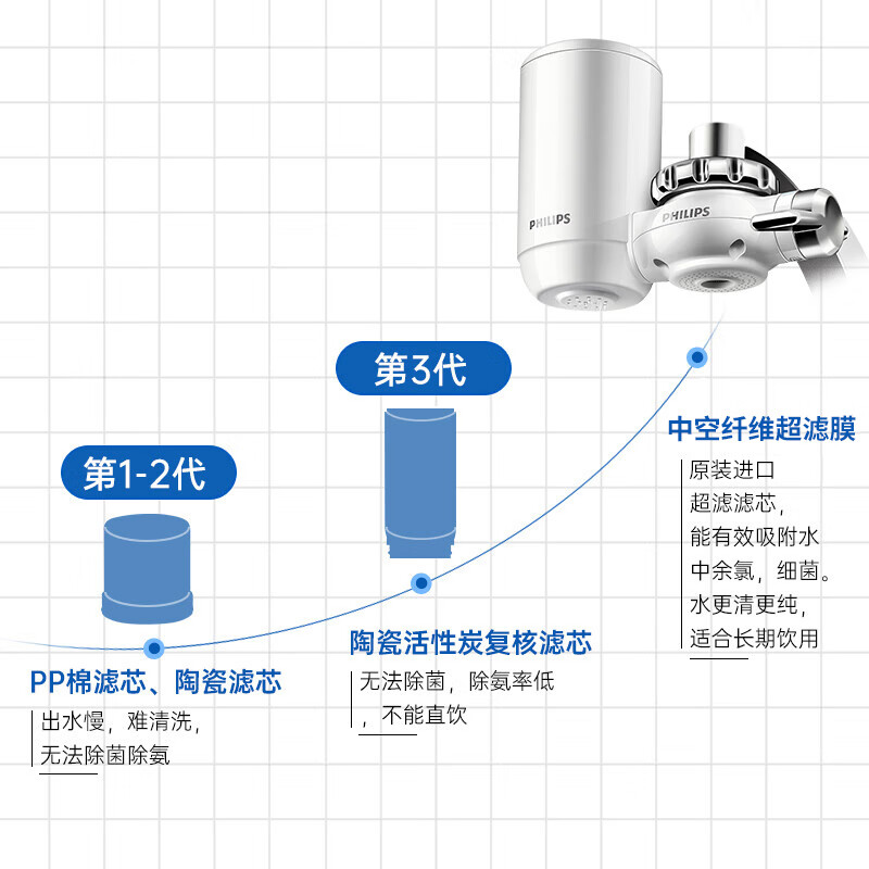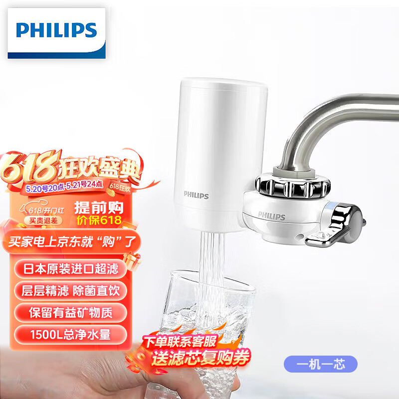 飞利浦(PHILIPS)水龙头净水器厨房自来水过滤器 超滤直饮滤水器 WP3811一机一芯价格:309.00元!