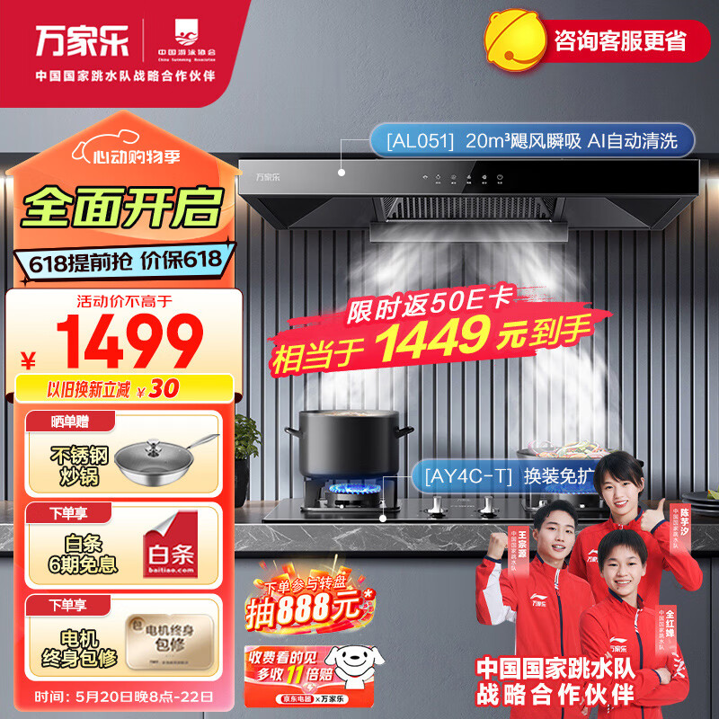 万家乐抽油烟机 欧式烟灶套装 20立方挥手自清洗油烟机5.0kW换新免扩孔燃气灶具套装AT051+AY4C天然气价格:1699.00元!