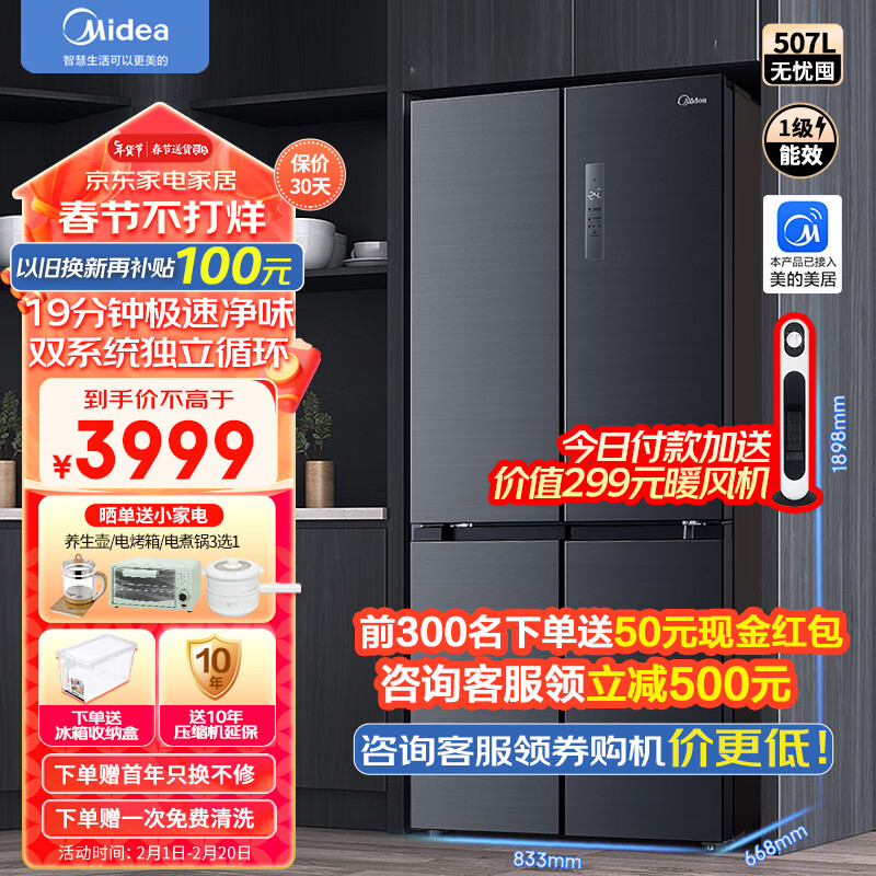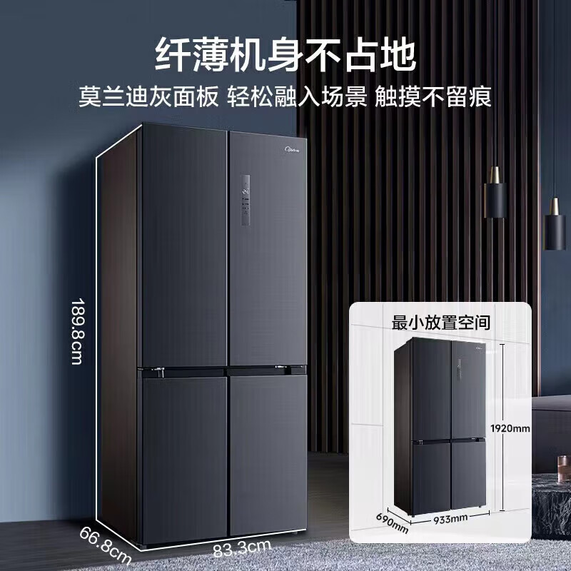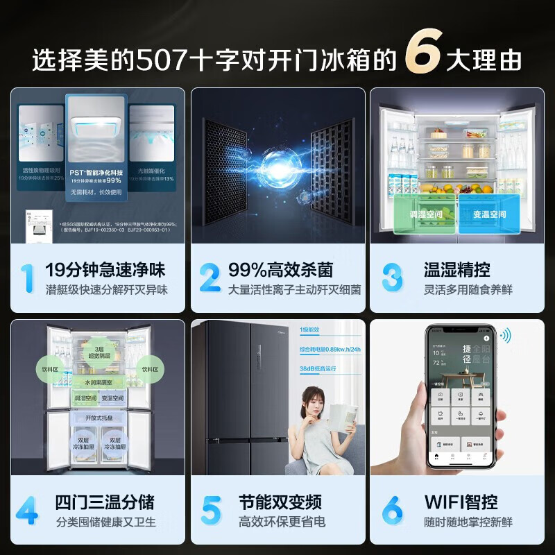 美的(Midea)507升十字对开门四门冰箱双系统冰箱一级能效变频 除菌净味风冷电冰箱+19分钟净味BCD-507WTPZM(E)价格:4498.00元!