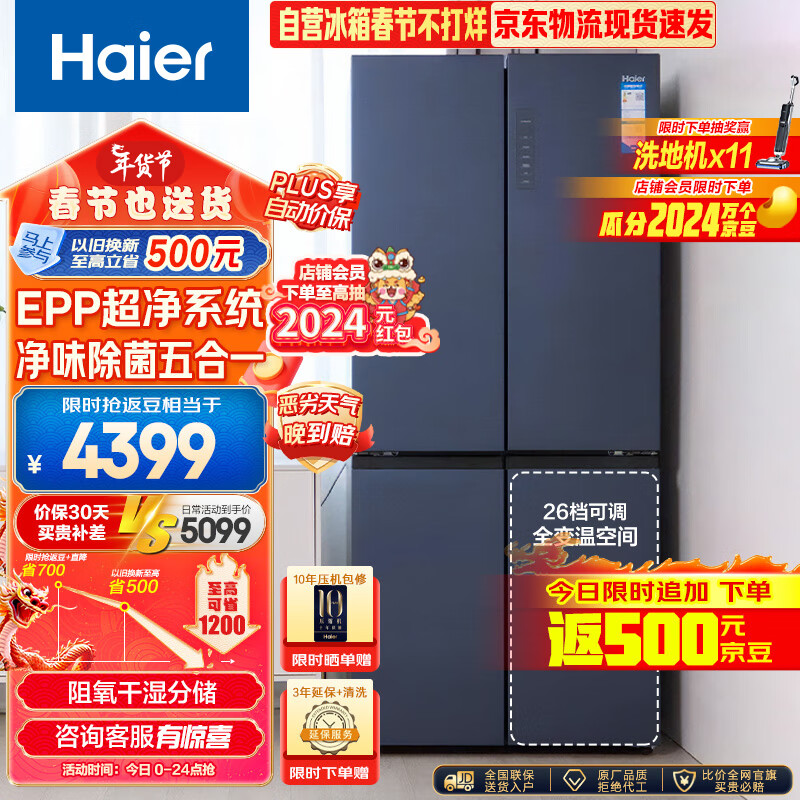 海尔(Haier)511升十字双开对开四开门电冰箱家用一级能效变频节能无霜超大容量超薄嵌入式BCD-511WGHTD79B9U1价格:5099.00元!