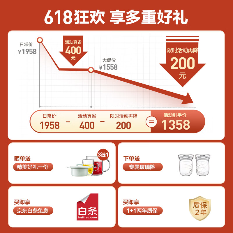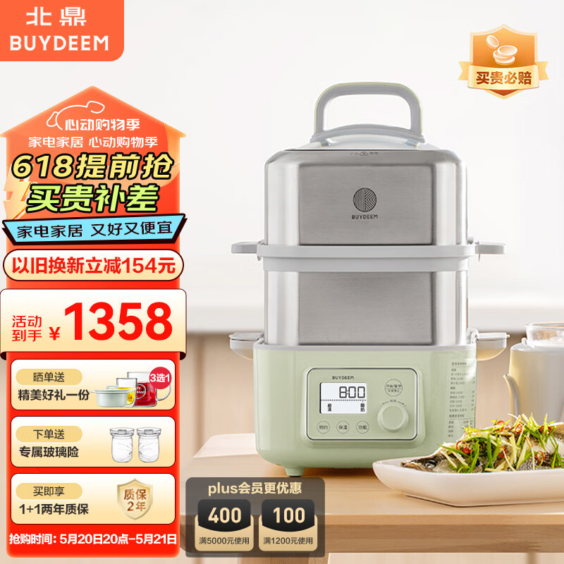 北鼎蒸炖锅家用电蒸锅多功能隔水炖全自动预约多用途浅杉绿G56A【含炖盅套件+二层蒸架】价格:1358.00元!