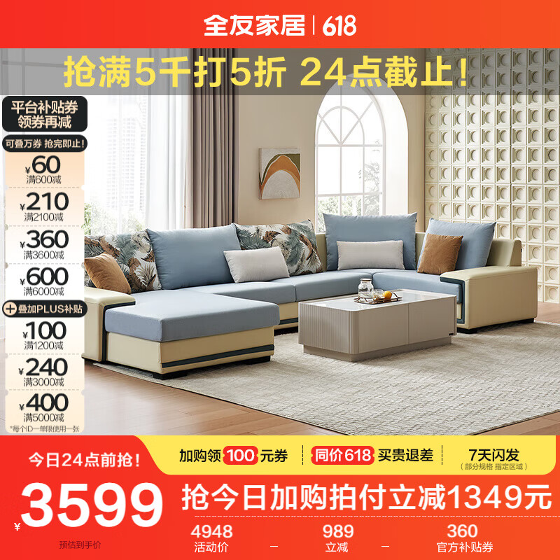 全友家居 家用布艺沙发现代简约大户型贵妃沙发家具客厅实木架102085价格:4948.75元!