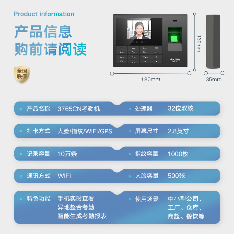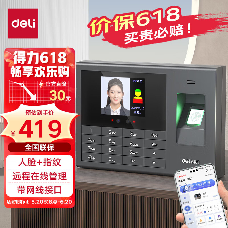 得力智能云考勤机 打卡机人脸+指纹 快速识别 wifi联网 在线管理考勤 升级网线版3765CN价格:419.00元!