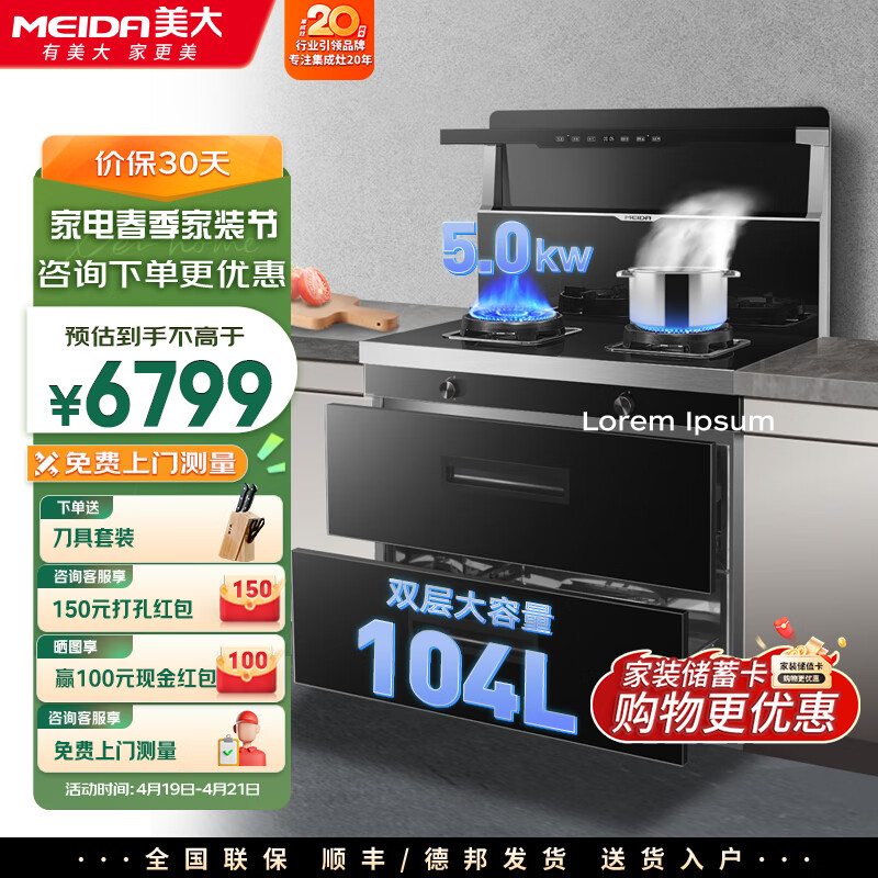 美大(MEIDA)V9-A消毒柜款集成灶一体式 无油网设计 智能双变频燃气灶侧吸式家用 不锈钢 (液化气)价格:6799.00元!