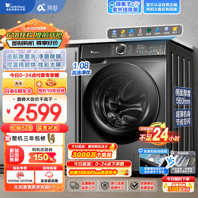 小天鹅(LittleSwan)滚筒洗衣机全自动 浣彩系列 10KG洗烘一体 巡航除菌 彩屏智能投放 1.08洗净比 TD100VT6XR17价格:2569.00元!