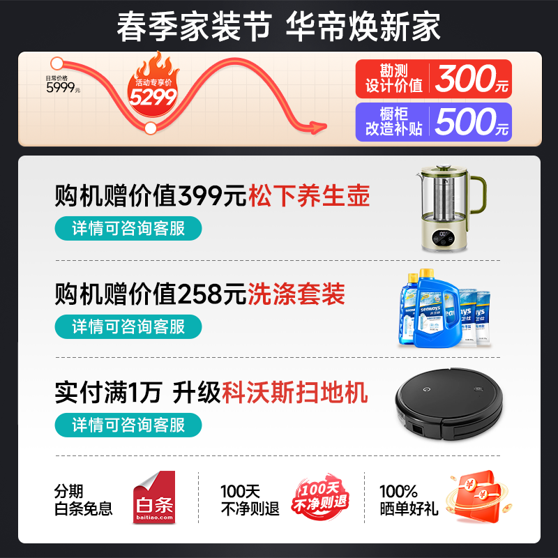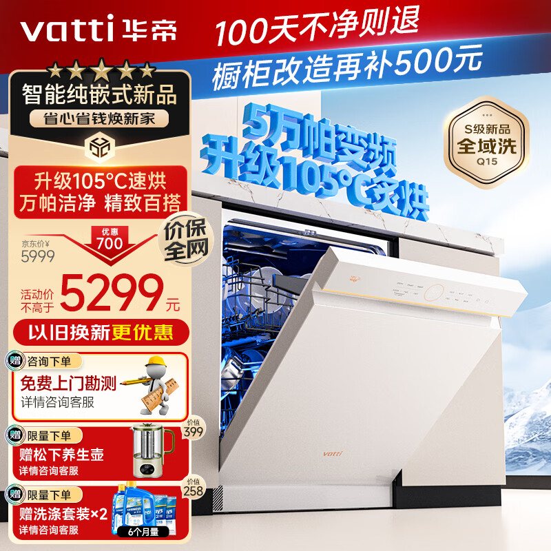 华帝(VATTI)15套嵌入式白色洗碗机 5万Pa变频高水压 五除菌一级水效 家用105℃烘干分层洗 白月光系列iQ15价格:5299.00元!