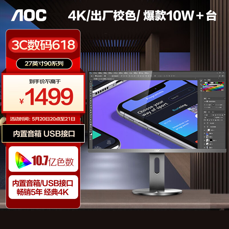 AOC 27英寸 4K高清 IPS广视角 99%sRGB 商用办公节能 低蓝光不闪 三边微边 液晶电脑显示器 U2790PQU价格:1499.00元!