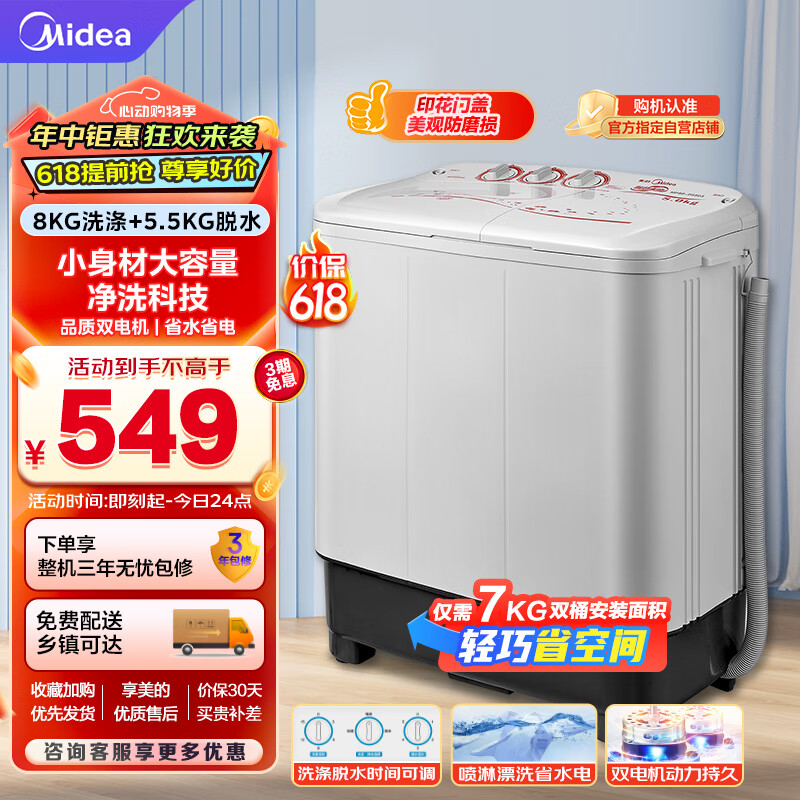 美的(Midea)双桶洗衣机半自动 MP80-DS805 8kg大容量 半自动洗衣机 洗8kg+甩5.5kg 双缸洗衣机价格:549.00元!